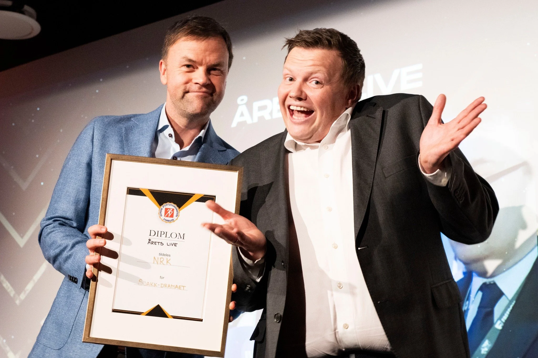 VANT I FJOR: NRK vant i kategorien «Årets Live». Ole Rolfsrud og Hans Solbakken var glade mottakere av diplomet. Foto: Erik Johansen/NSF